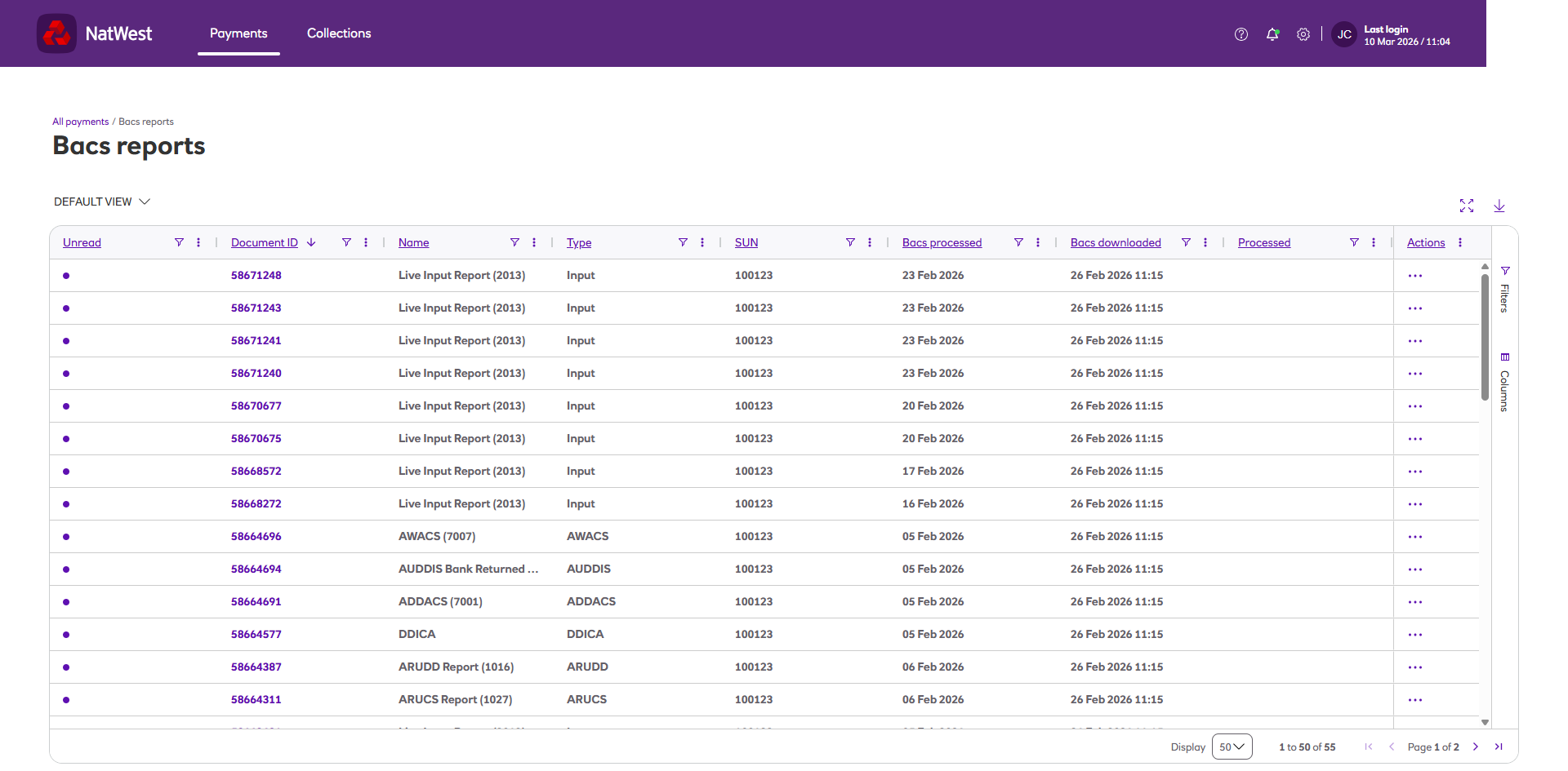 Bacs reports are provided by the Bacs service, and are used to feed back information on your submissions. The definitions of all the reports are in the following sections and then there is also guidance on how to download them from within the solution.