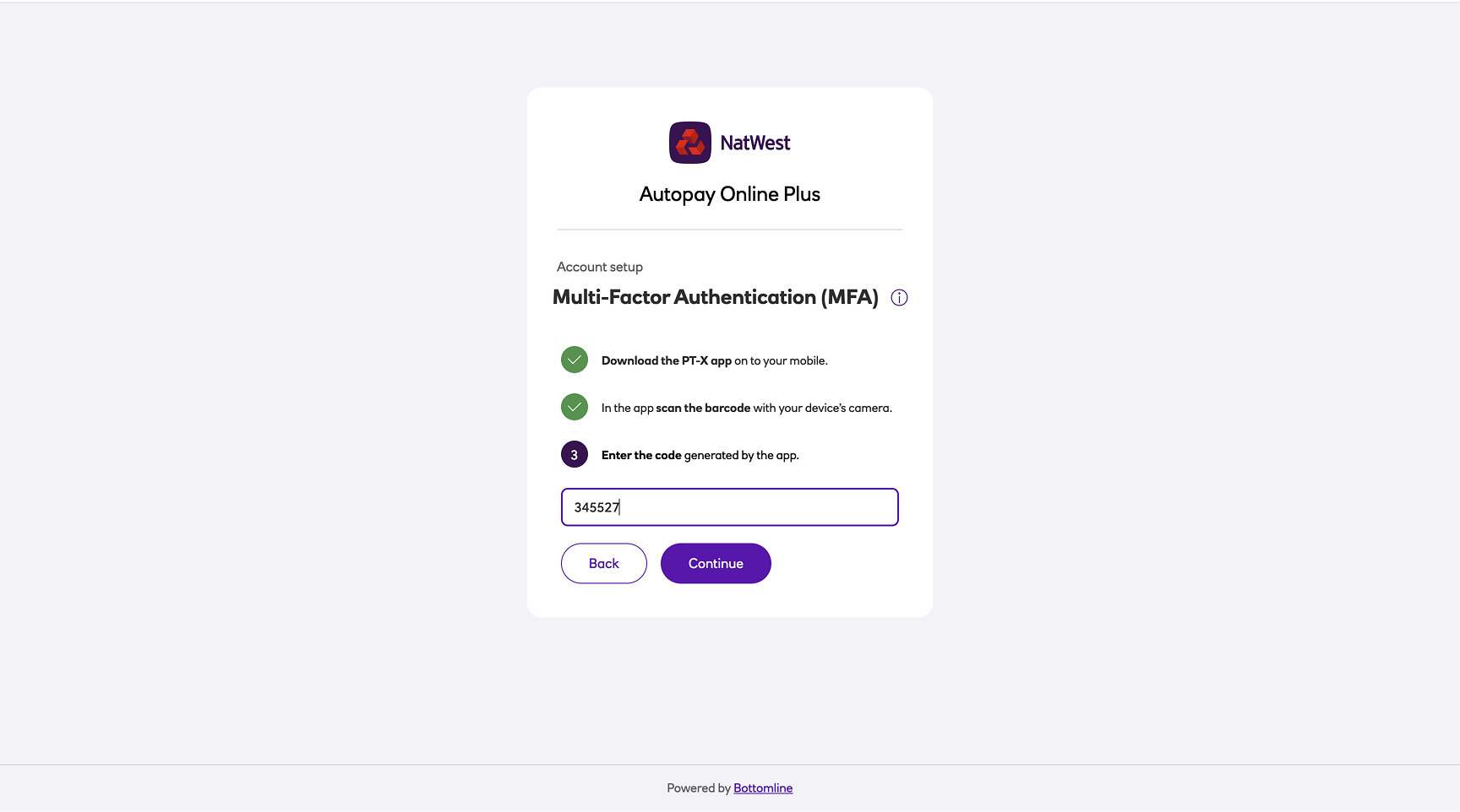 Enter the code that is generated by the Bottomline PTX Auth app.