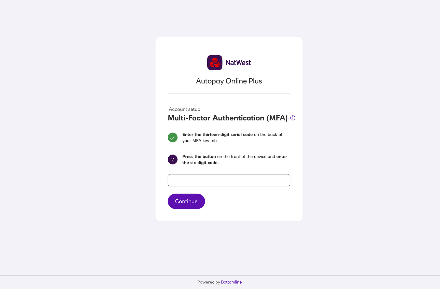 Multi-Factor Authentication (MFA) is a security feature that requires more than one piece of evidence to authenticate you, decreasing the likelihood of your account being compromised. It provides a one-time code when logging into and making payments in Autopay Online Plus, alongside your username and password.
