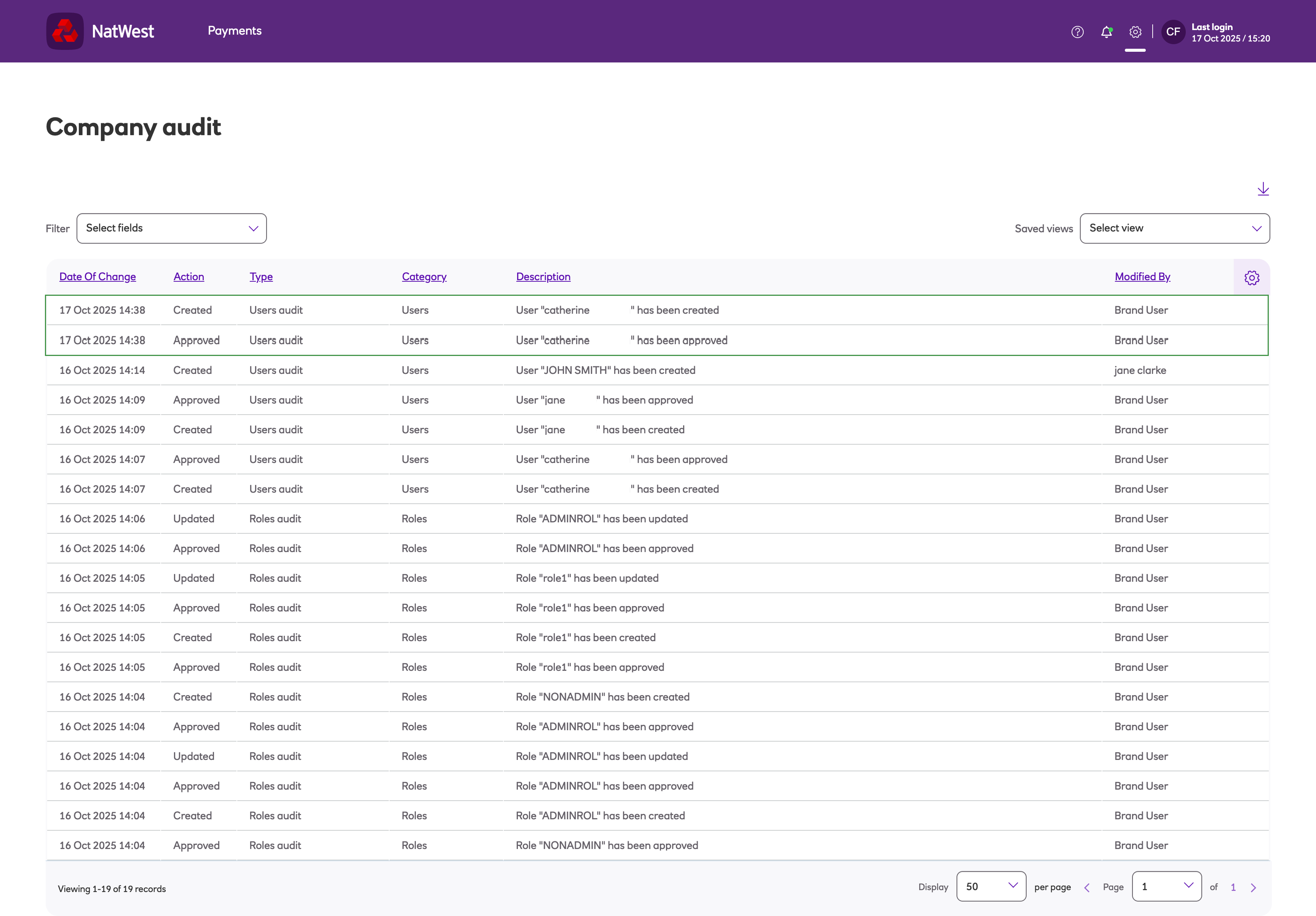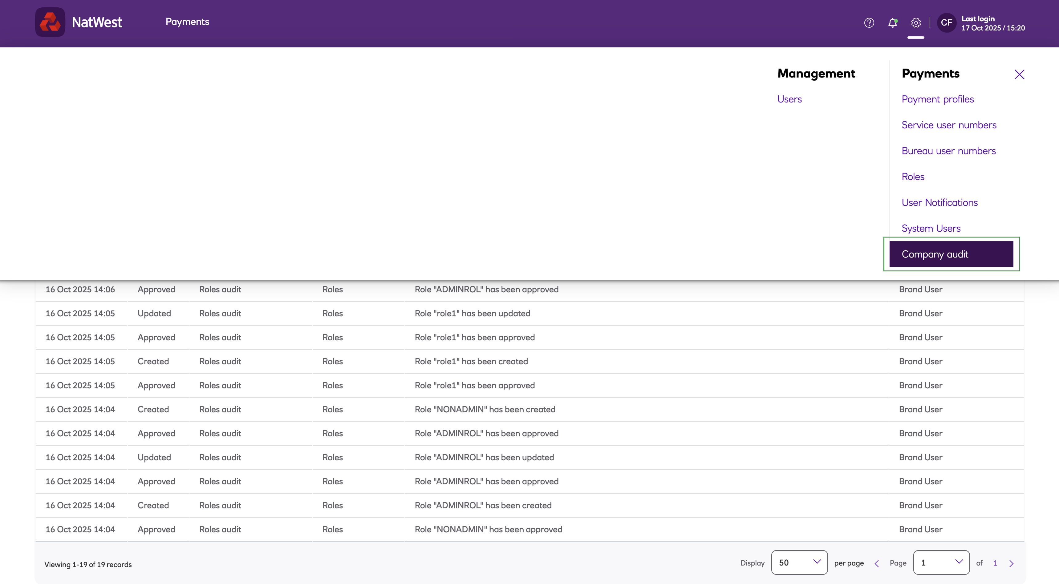 An audit trail of any changes made can be viewed from the Company audit screen.