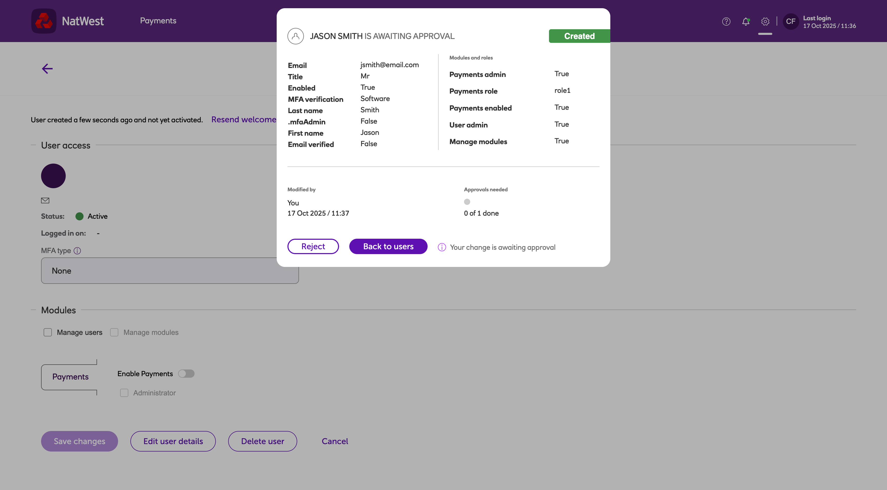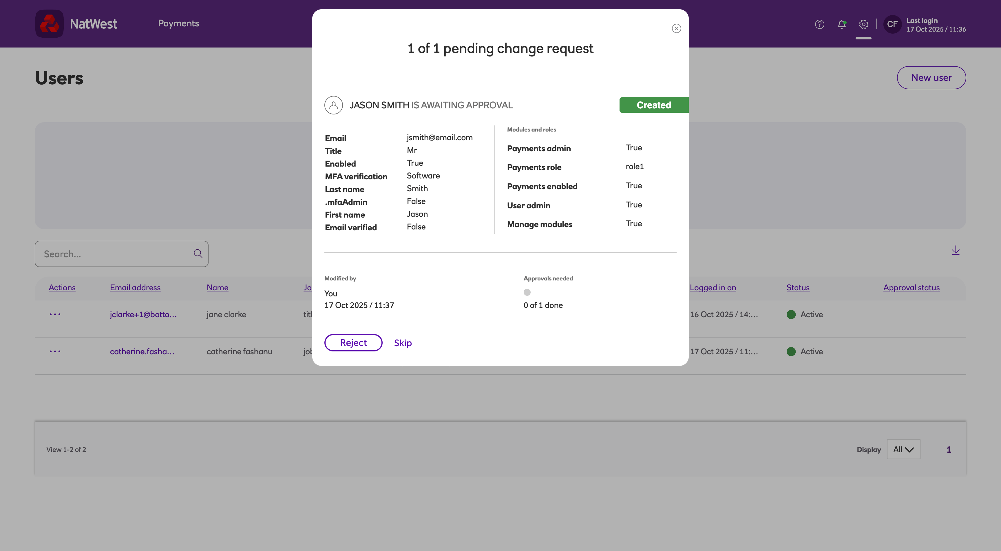 Administrator A updates a user and a change request is generated. At this point they have the option to reject their changes or continue with their change request and return to the Users screen.