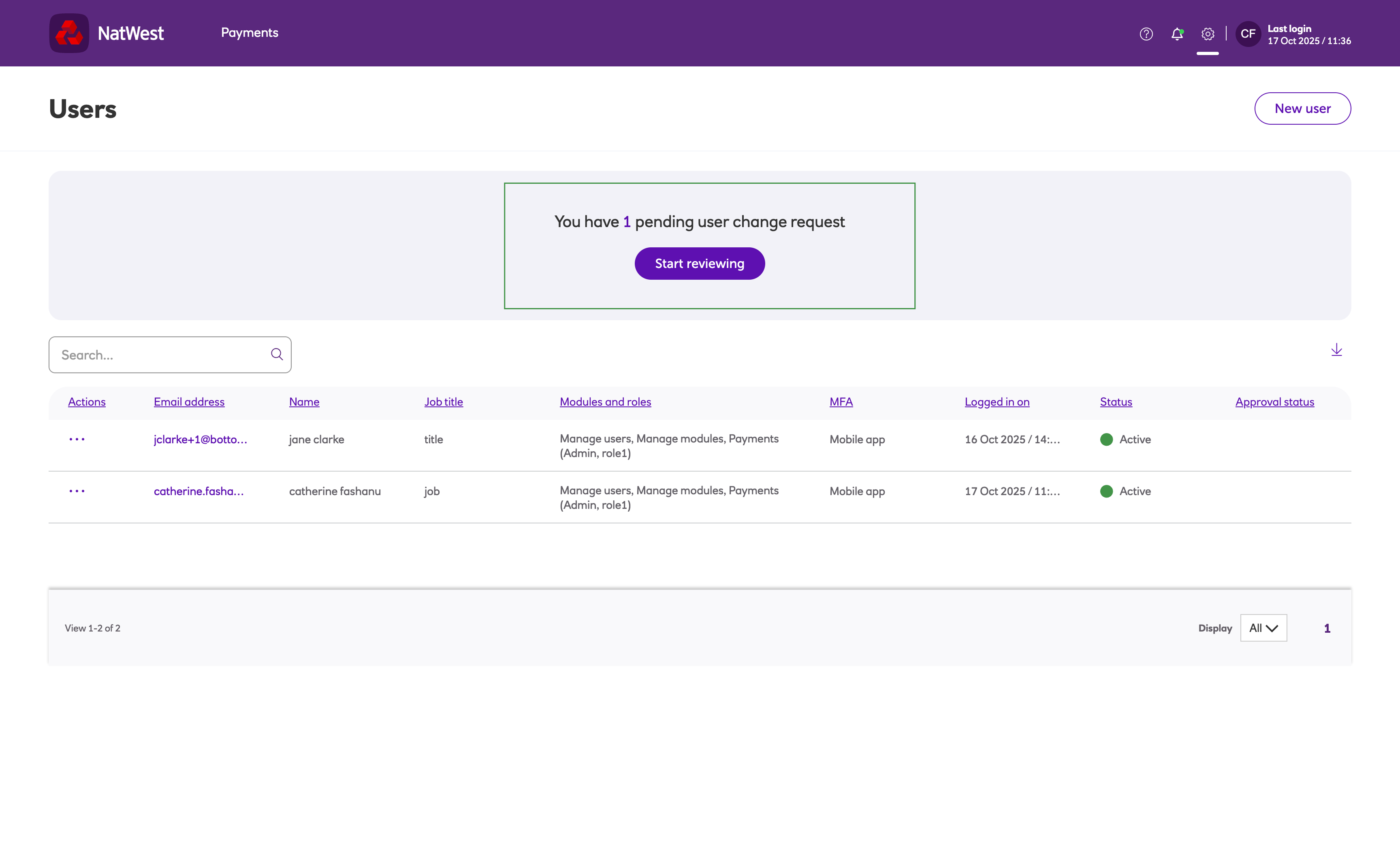 From the Users screen, administrator A or administrator B clicks Start reviewing to review any pending change requests.
