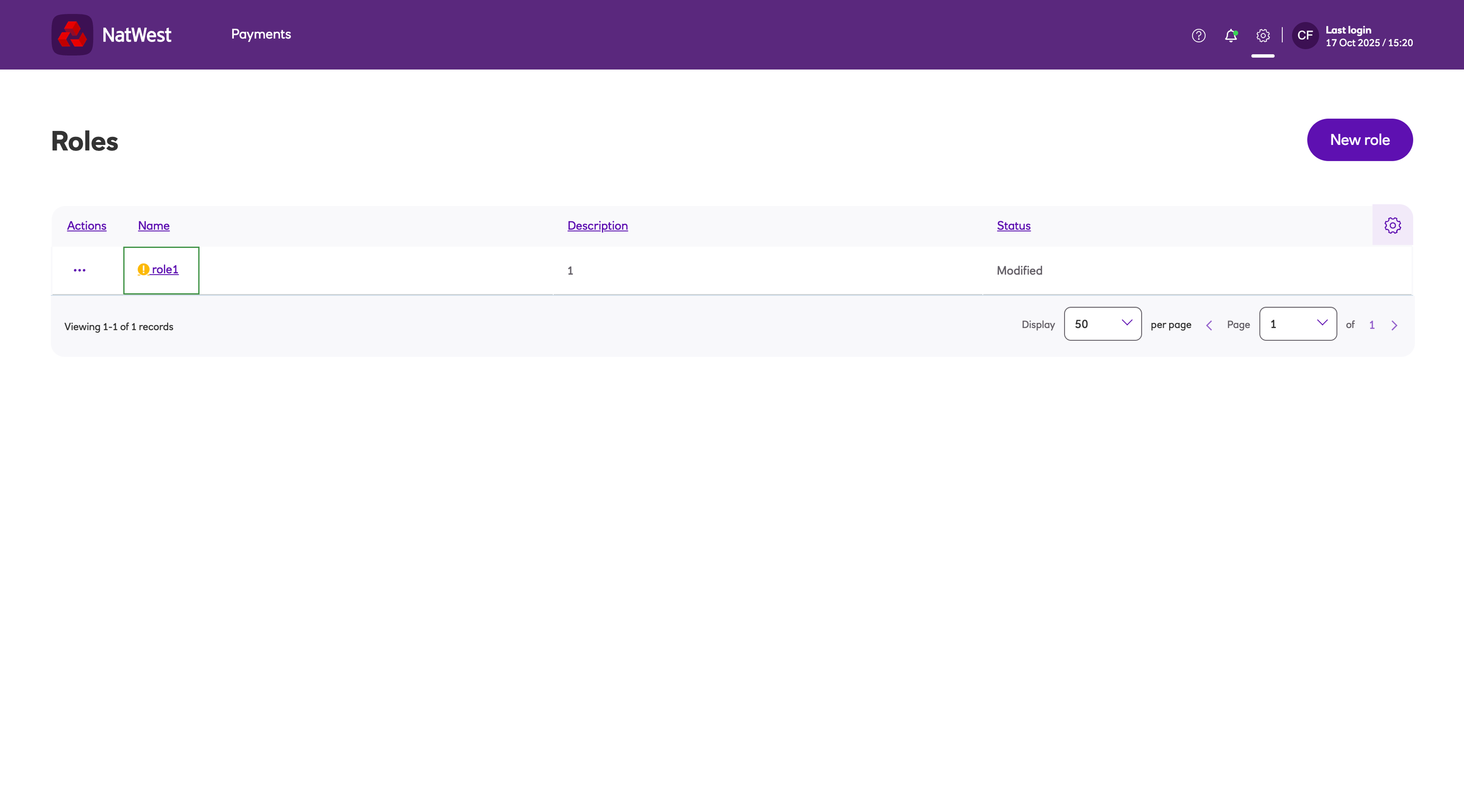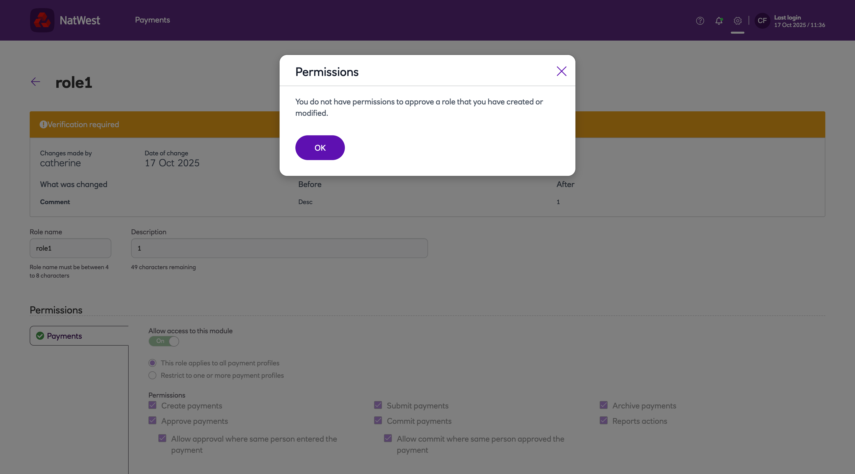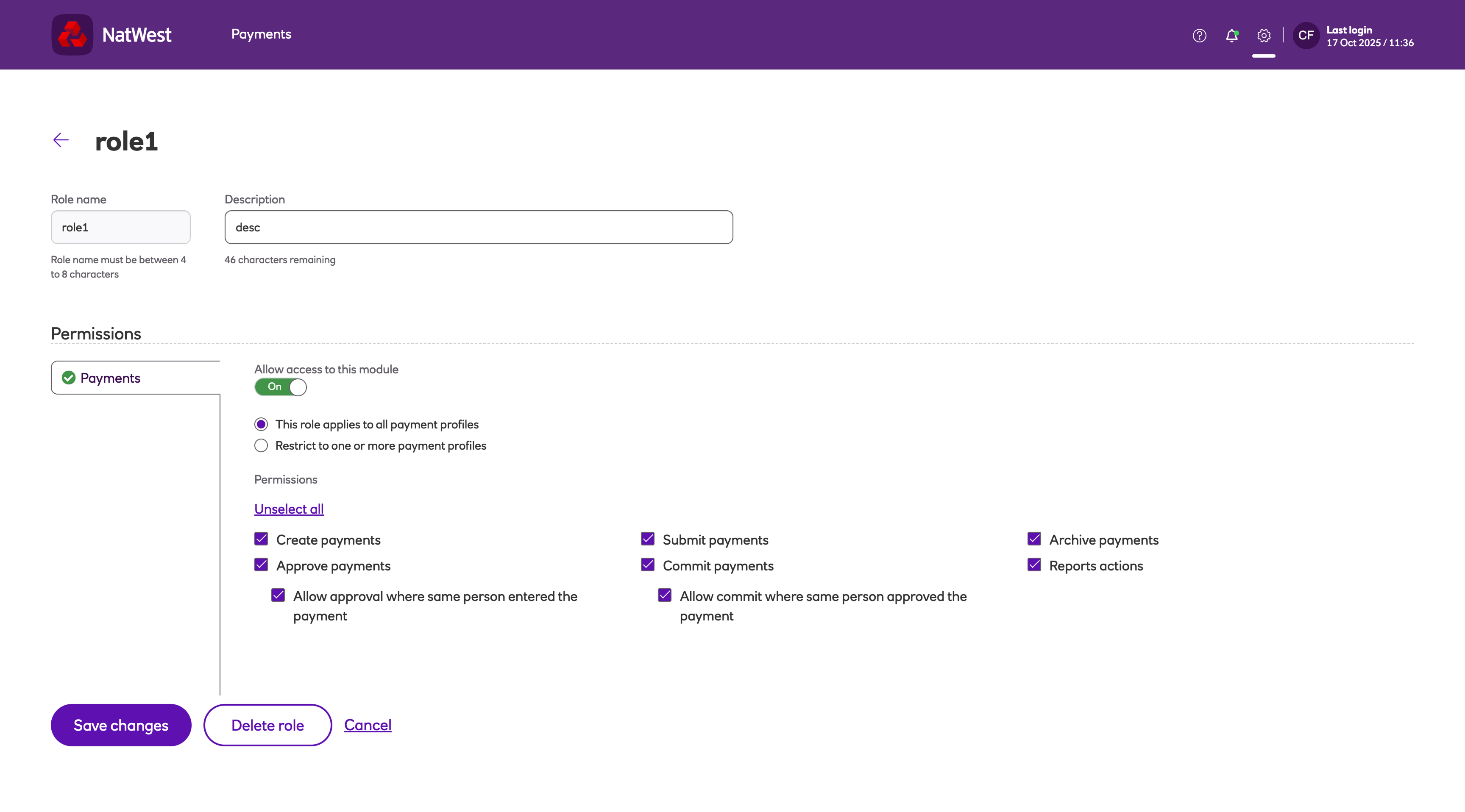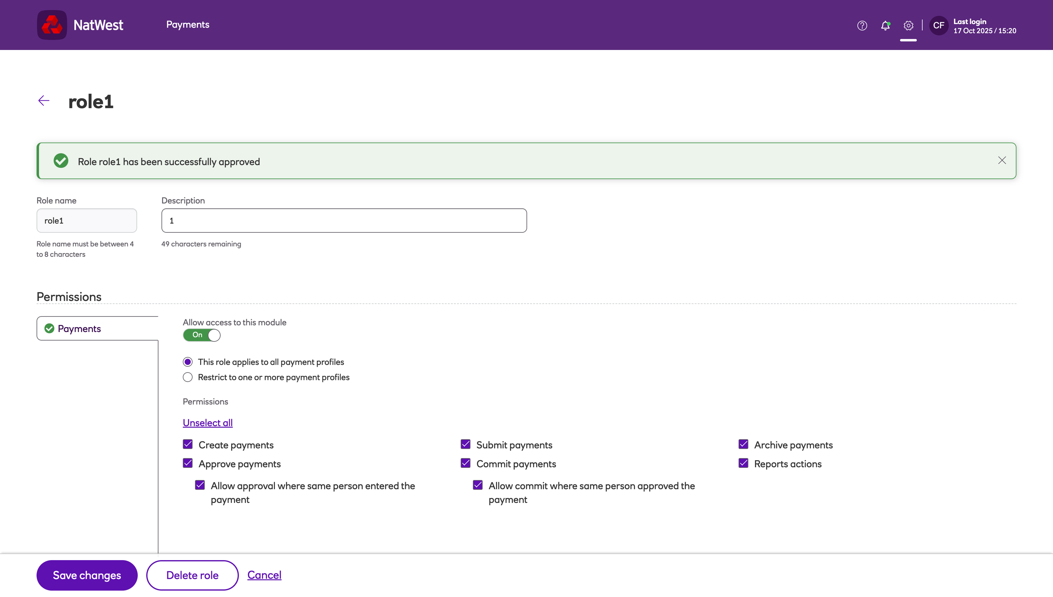 Administrator A makes changes to a payment role, and clicks Save changes.