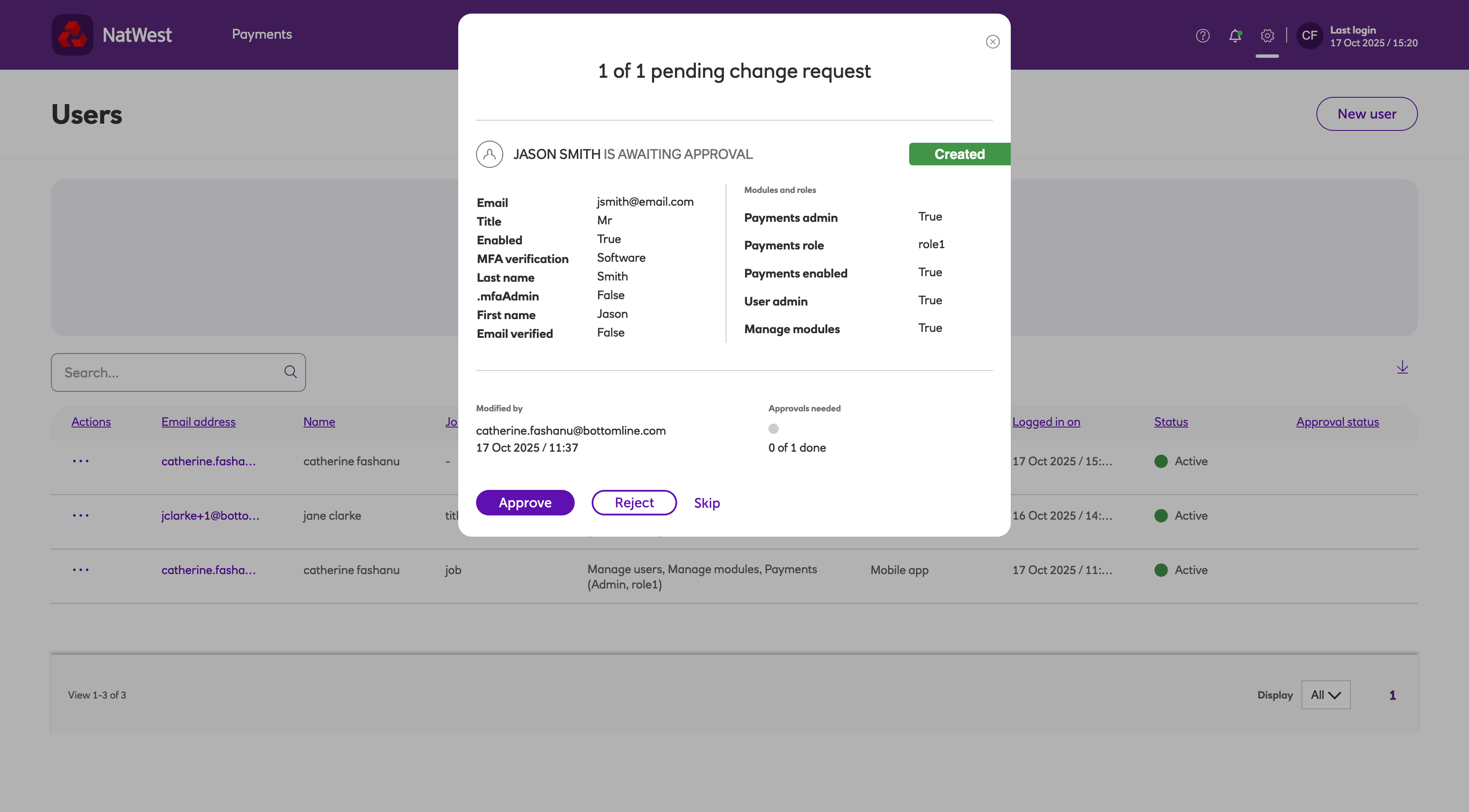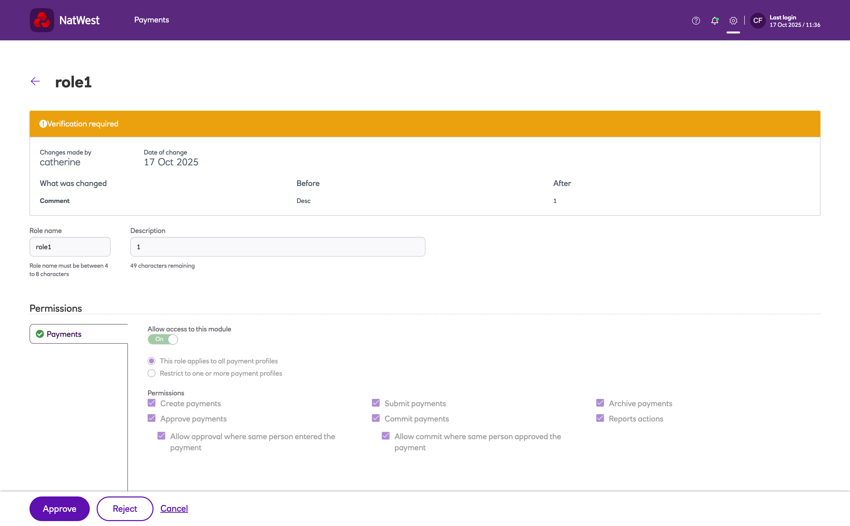 When Administrator B selects the role, they will have the option to approve or reject the change: