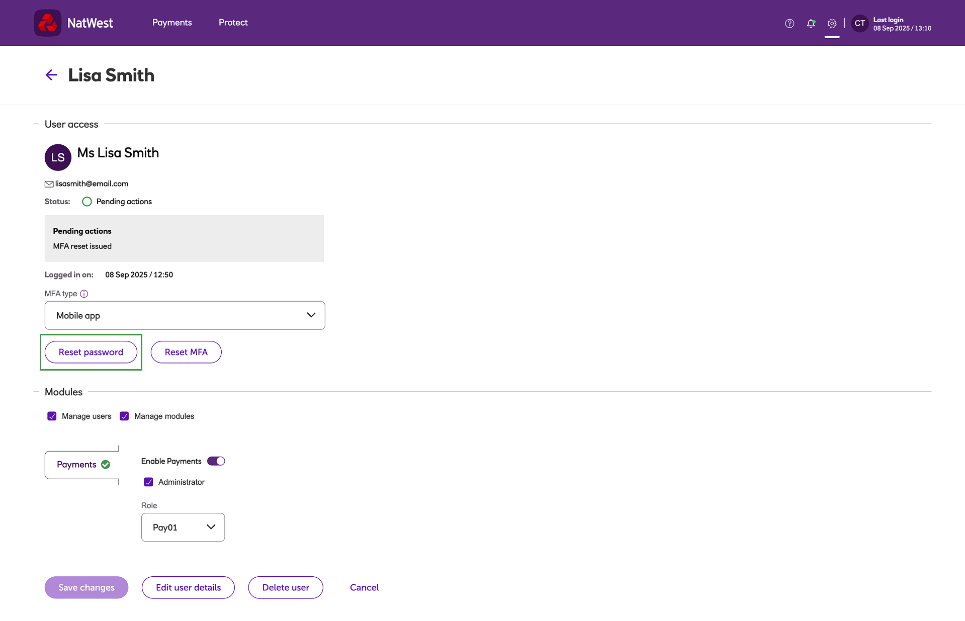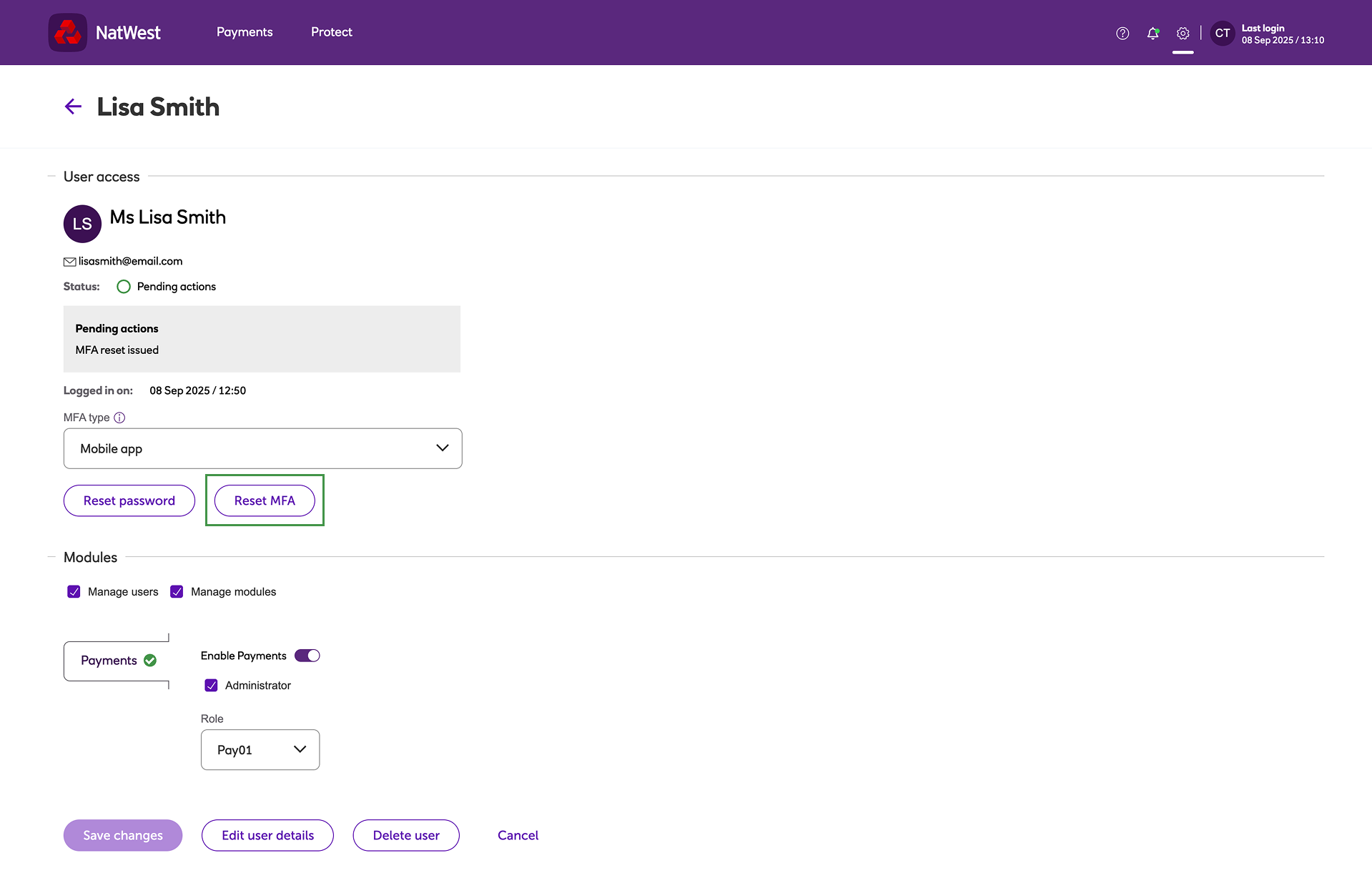 Resetting a user's MFA settings