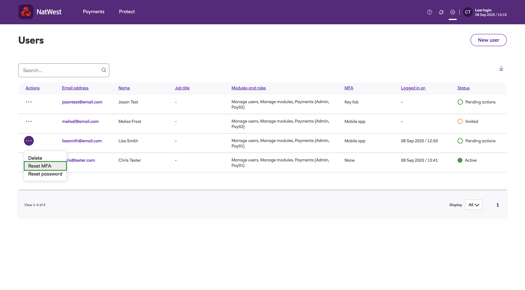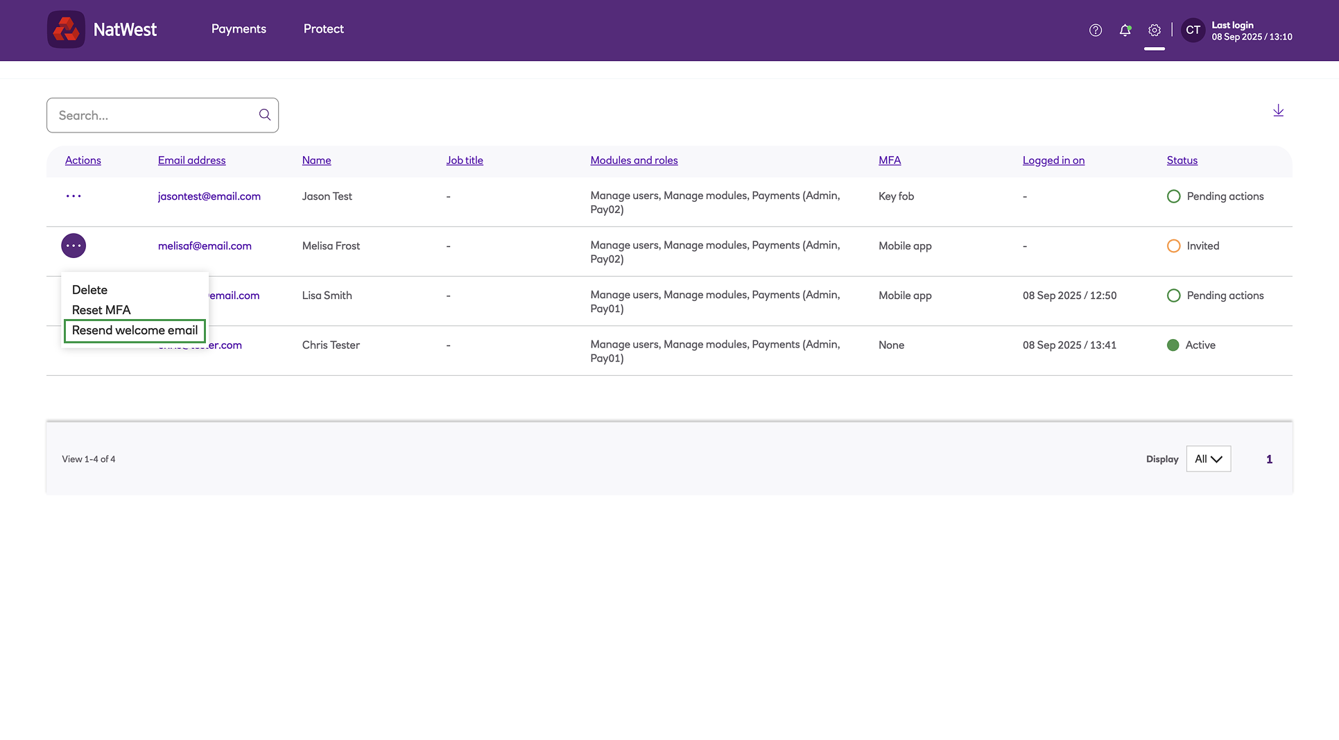 The Resend welcome email option is only available for users whose accounts have not been activated. For such users, the Reset Password and Reset MFA options are not available.