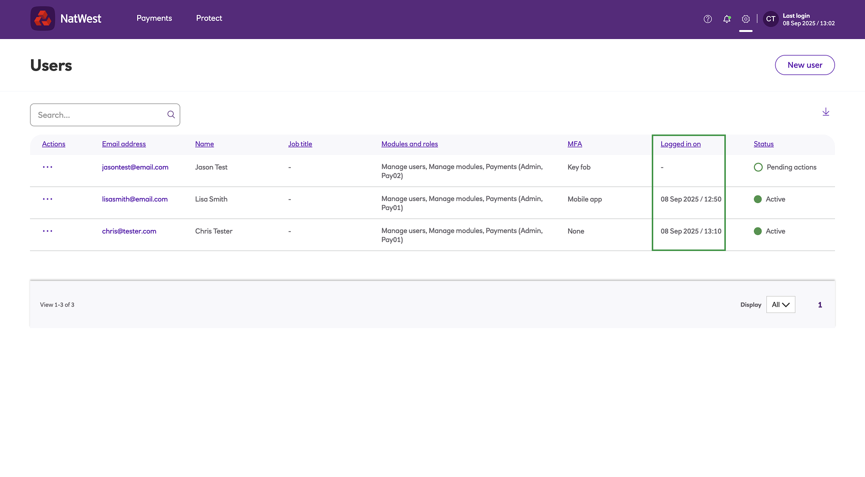 For administrators, the Logged in on column on the Users grid contains the date and time that a user was last logged in to Autopay Online Plus. The value is also visible when viewing a user's details.