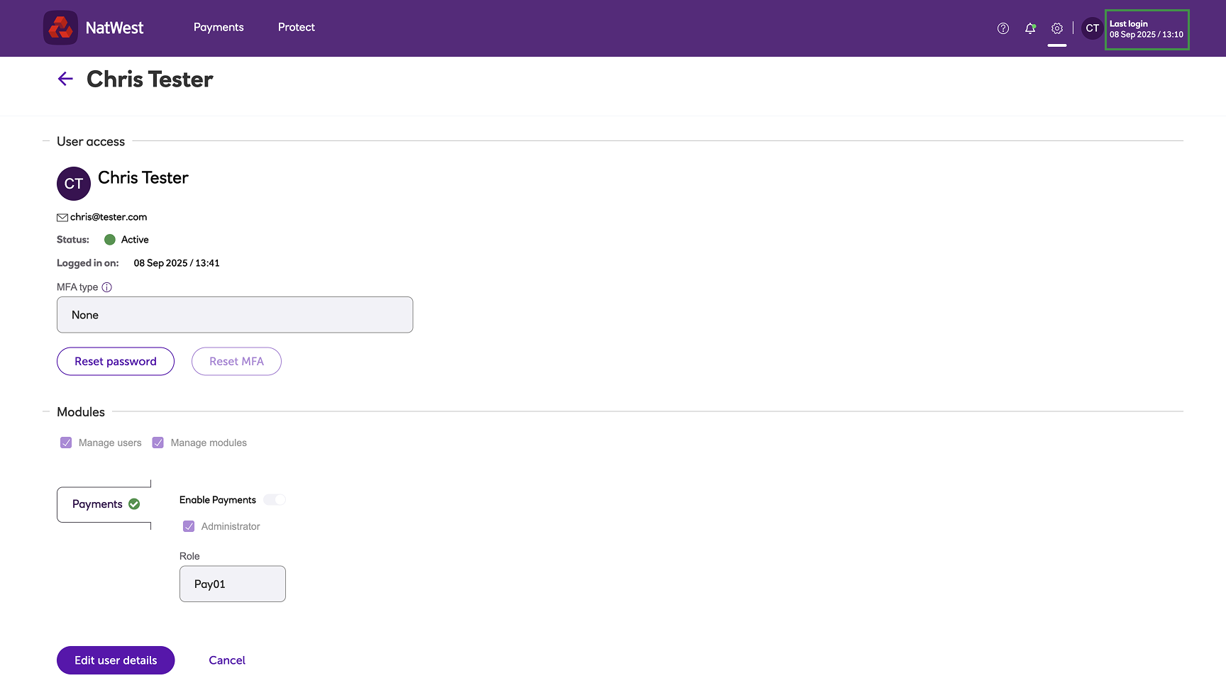 - Administrator (with user management) - requires the Manage users and Manage modules permissions, access to the Payments module, the Administrator option enabled, and a valid role assigned.